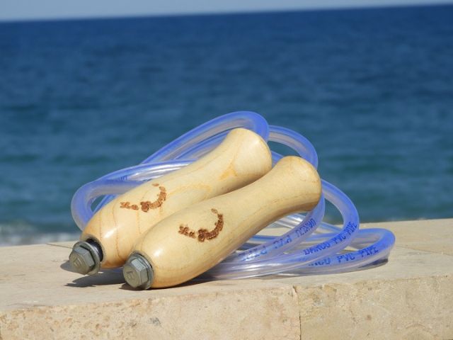 Materiaal: Houten handvaten, PVC touw
